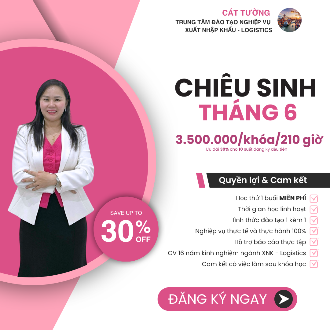 Trung tâm Cát Tường trân trọng thông báo chiêu sinh cho khóa học mới bắt đầu từ tháng 6 này. Với phương châm “Học phải có việc làm”, chúng tôi cam kết mang đến cho học viên môi trường học tập chất lượng cao cùng với giảng viên 16 năm kinh nghiệm trong lĩnh vực XNK – Logistics. Đừng bỏ lỡ cơ hội nâng cao tri thức với mức chi phí hợp lý, tiết kiệm. Hãy đến với Cát Tường để khởi đầu hành trình chinh phục tri thức và mở rộng tương lai. Đăng ký ngay hôm nay để nhận ưu đãi rủng rỉnh.